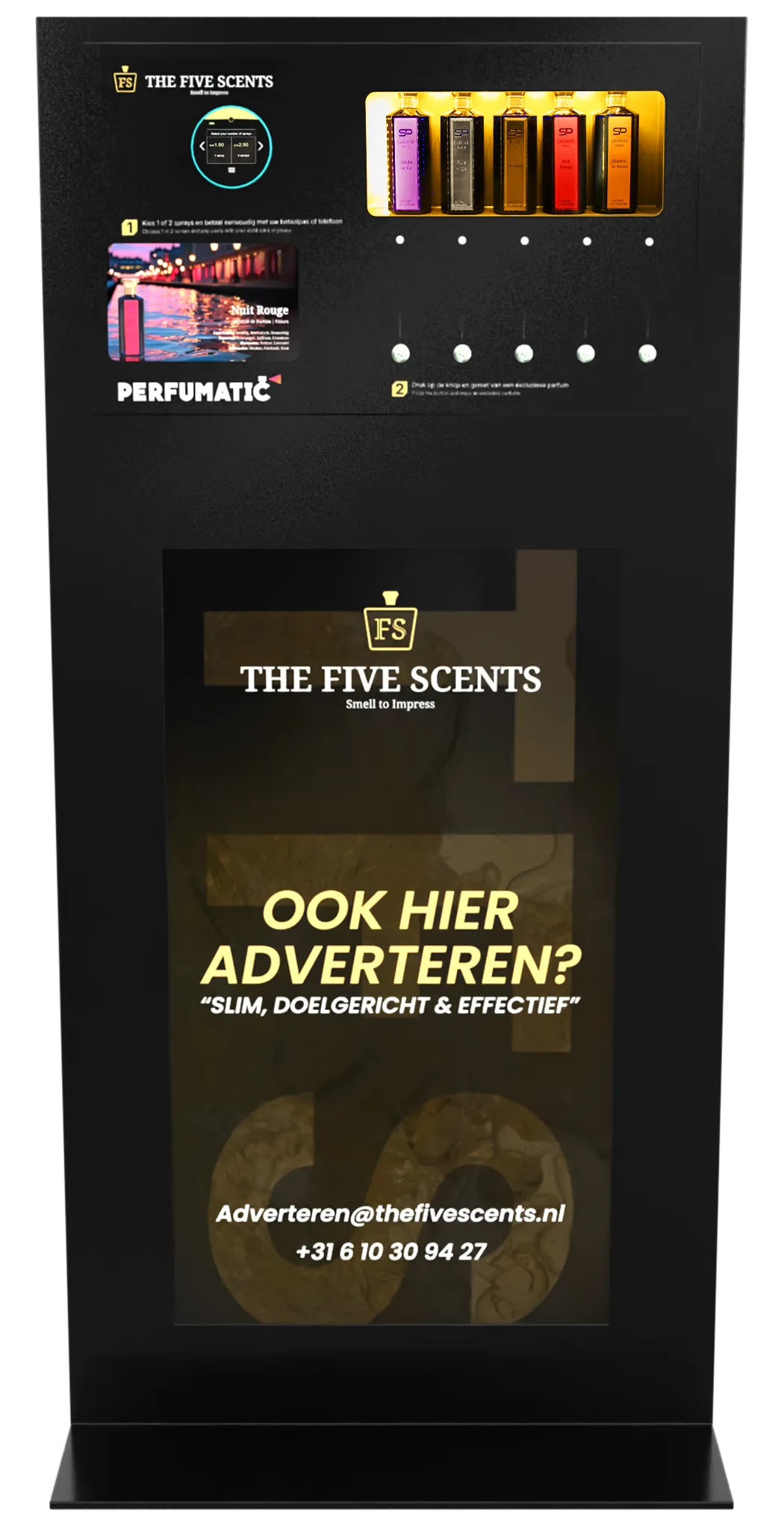 The Five Scents biedt een vernieuwend advertentieconcept waarbij luxe parfumdispensers worden gecombineerd met digitale 4K-schermen. Een unieke manier om uw merk te presenteren in een high-end omgeving, recht in het blikveld van een waardevolle doelgroep.